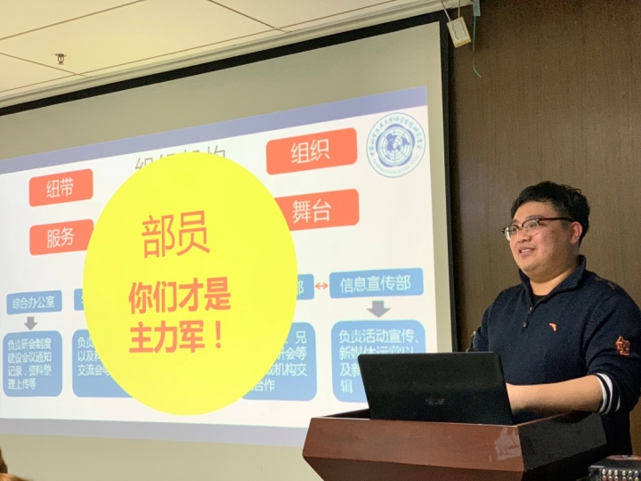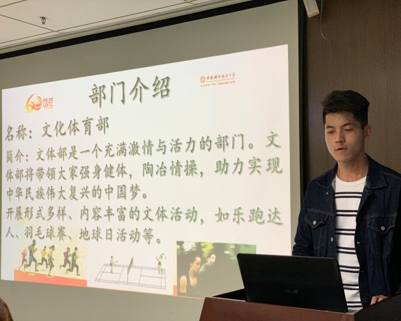 李宇鑫部长对学术科技部和成员进行了介绍,并总结了之前承办的一些活动,将部门定性为负责学术论坛及科研经验交流会等活动,他希望这学期学术科技部能够结合同学们的需求,多办一些活动。最后文化体育部部长刘豪杰对文体部进行介绍,他指出文体部是一个充满激情与活力的部门,将带领大家强身健体、陶冶情操,助力实现中华民族伟大复兴的中国梦。文体部开展的活动形式多样、内容丰富,如乐跑达人、羽毛球赛、地球日活动、乒乓球赛等,希望大家以后能够多多参与。四个部长的介绍各有特色,十分精彩。