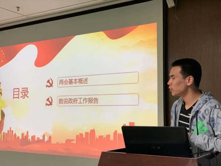 大会第三项是观看两会视频,孙超副主席带领大家一起学习两会精神。