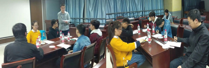 在前期宣传结束后,项目组对报名同学进行分批面试。面试分为两个环节,无领导小组讨论和单独面试。在无领导小组讨论阶段,参加面试的同学阅读给定的新闻材料后,畅所欲言,积极讨论,表达出自己的观点以及对他人观点的质疑,现场气氛十分活跃。