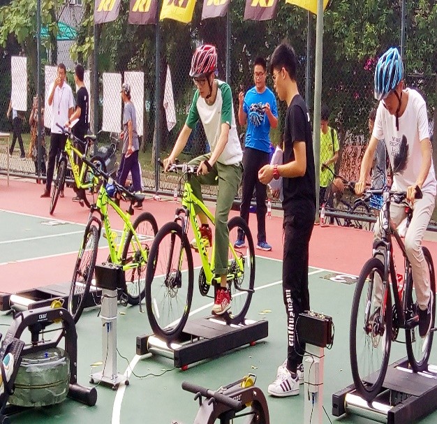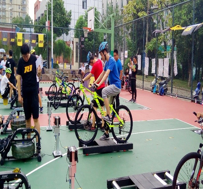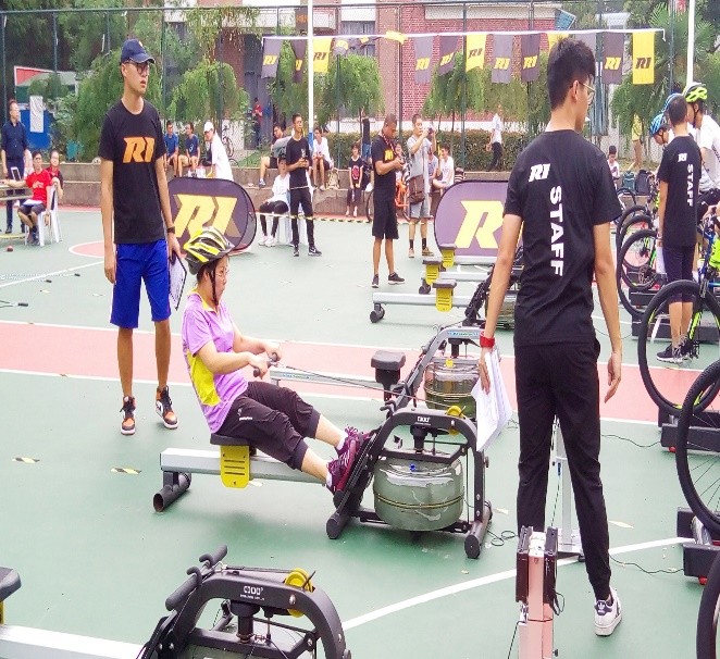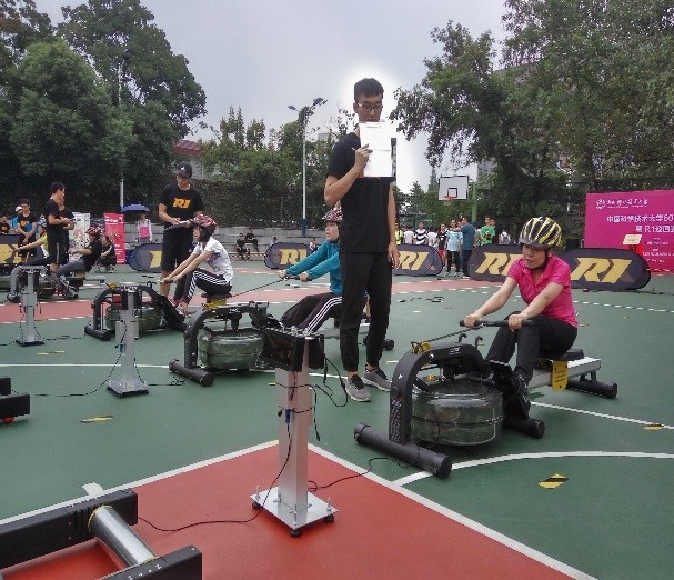 本次比赛由团体竞技赛与个人挑战赛两部分组成,其中团体竞技赛包括滚筒自行车-骑行赛、划船机-赛艇赛、跳绳赛三个子项目,每位运动员要连续完成三个子项目才算完赛,完赛时间作为唯一排名标准。我院共派出本科生代表队和研究生代表队两支队伍。每只队伍各有4名参赛队员。除此之外,我院有多名同学现场报名并参与了个人挑战赛。