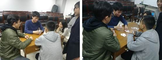 第三项,桌游活动。约晚上九点半左右,大家开始玩桌游活动。根据各自兴趣爱好,大家分成了两桌,一桌玩“掼蛋游戏”,另一桌玩狼人杀游戏。两款桌游寓教于乐,是很受大家欢迎的益智类游戏。