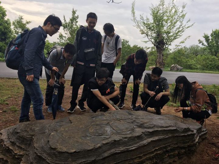 紫蓬山是省级地质公园,主要是砂岩沉积地貌,但是裂隙不发育,没有看到明显的地质构造现象。在参观过程中,陈老师不忘向同学们讲授地质学基础知识。在草地上的一处沉积岩处,陈老师细心地向同学们指出灰岩、砂岩和泥岩的交错分布。这预示着海相和陆相沉积的交替出现,证明了海进与海退反复进行,当地沉积环境并不稳定。
