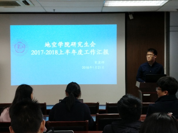本次会议的主要内容有:①地空学院研究生会2017-2018学年第一学期工作总结;②地空学院研究生会2017-2018学年第一学期优秀部门和学生干部表彰。