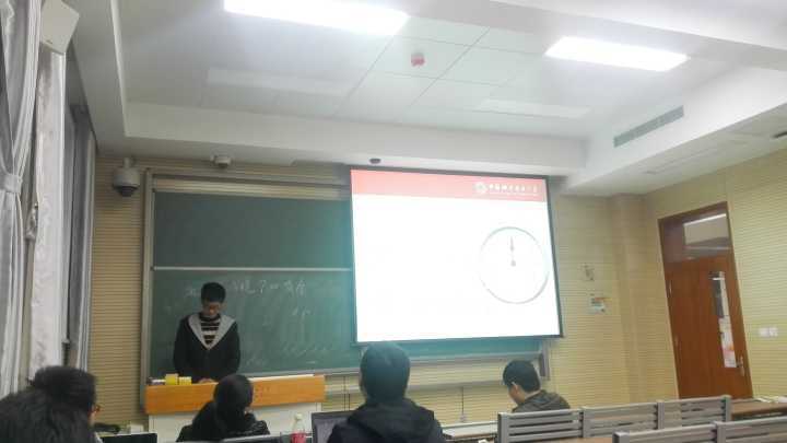 7:30班会准时召开。第一项是班委工作汇报,由副班长王旭照同学和团支书肖子聪同学作为主讲人。首先是副班长王旭照给大家介绍我们当时申请先进班集体时的一些情况。他先简单介绍了我们班的班级情况,然后给我们做了先进班集体答辩ppt展示。我们班同学都是有理想、有追求,有担当、有作为,有品质、有修养的六有大学生。所谓理想,即科研。追求:经验交流会。有担当:公益活动。有作为:实习活动。有品质:不忘初心跟党走。我们曾经获得校级活力团支部荣誉称号。有修养:学风考风,山水情怀——科研热情。