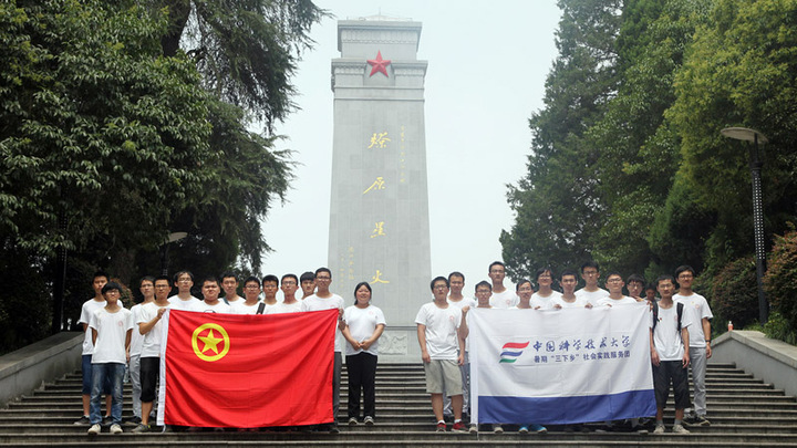 11时,中国科大三下乡小分队从革命纪念馆出发,前往革命烈士纪念碑,对为中国革命事业奉献的革命烈士献上敬意,并于碑前合影。在碑前广场俯瞰梅山镇,可以看到经济实力虽然不足,但是发展势头十足。