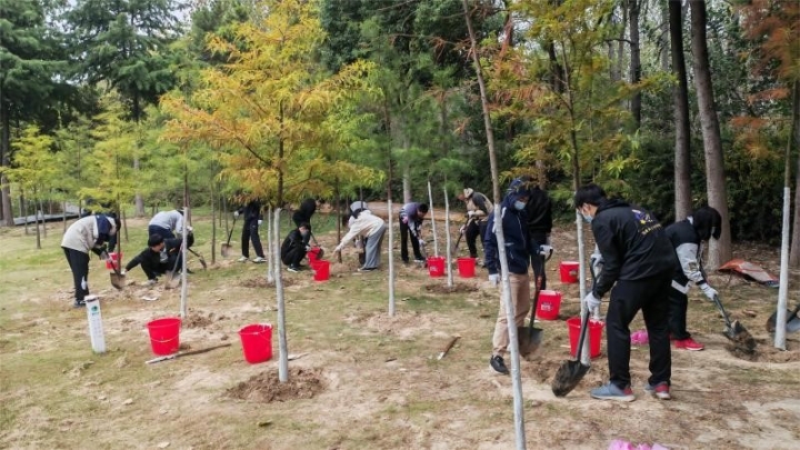 当天下午一点半,同学们在东区西门准时集合,乘坐大巴前往滨湖森林公园。到达森林公园后,同学们在工作人员的带领下来到了开展活动的杉树林,领取了活动所需的手套、铁锹、刷子等。紧接着,几位工作人员向大家详细示范和讲解了杉树的开盘、刷白过程以及背后的理论知识。