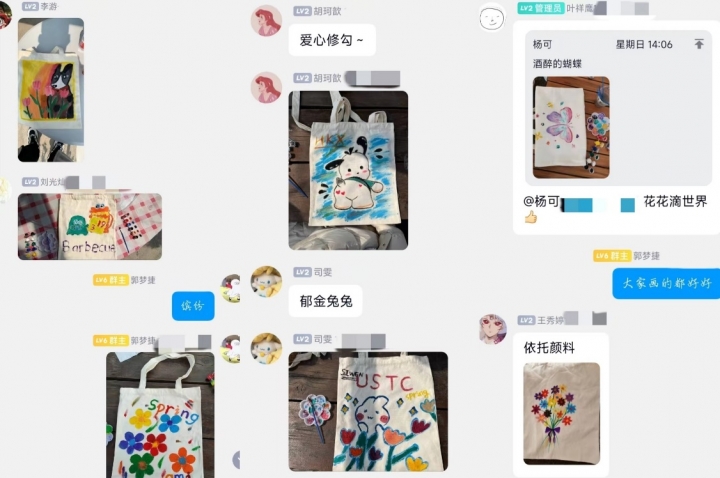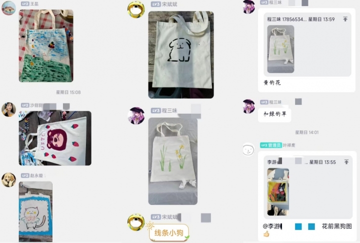 经过一个多小时的创作,一幅幅或可爱或诗意的画,让原本素净的帆布包变得动人起来。大家把自己的创作成品发到群里并为作品起名字。