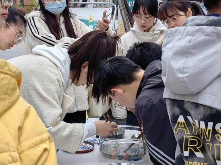 活动一共有6个小游戏,其中最受欢迎的无疑是“筷子夹球”了。游戏要求玩家用筷子在最短时间内夹出15个球。虽然同学们平时经常用筷子吃饭,但只有在这次游戏中才真正的“筷”分高下了。