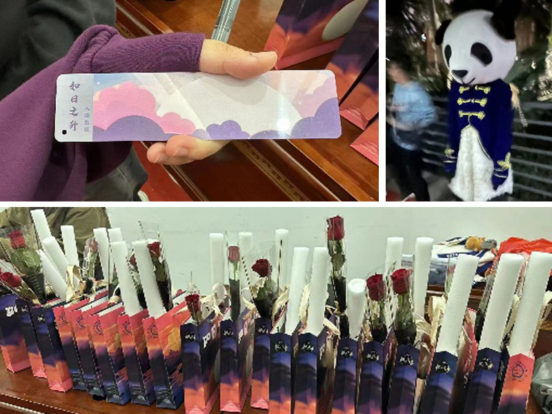最后,大家一齐上台,留下了宝贵的合影。这也代表着此次“如日之升”迎新晚会的圆满落幕。这次晚会,给大家留下的,不仅是对精彩节目的回忆,还有精美设计的书签、伴手礼以及紧张而又刺激的猜歌名与抽奖活动,对了,还有在门前迎宾的熊猫大哥呢。欢乐的时光总是短暂的,不过此次晚会虽已结束,我们在校园里的生活却还很长。祝福新同学们学业有成,收获满满!