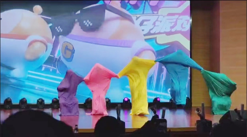 咦,这是什么,怎么几条花花绿绿的被子蹦蹦跳跳地上了台?哦,这是张朔、刘思涵、刘相宇、曹新宸以及李政樊等五位新同学带来的趣味节目,被子舞表演。看他们在台上跳来跳去,你是不是也跃跃欲试呢。
