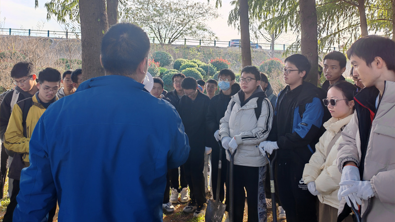 当天,同学们乘坐大巴车,来到合肥滨湖国家森林公园。在现场工作人员以及班委同学的组织下,同学们手持铁锹来到树林地,学习对树木的翻土、施肥以及刷白,并随之进行了实践操作,亲自感受劳动实践的过程。