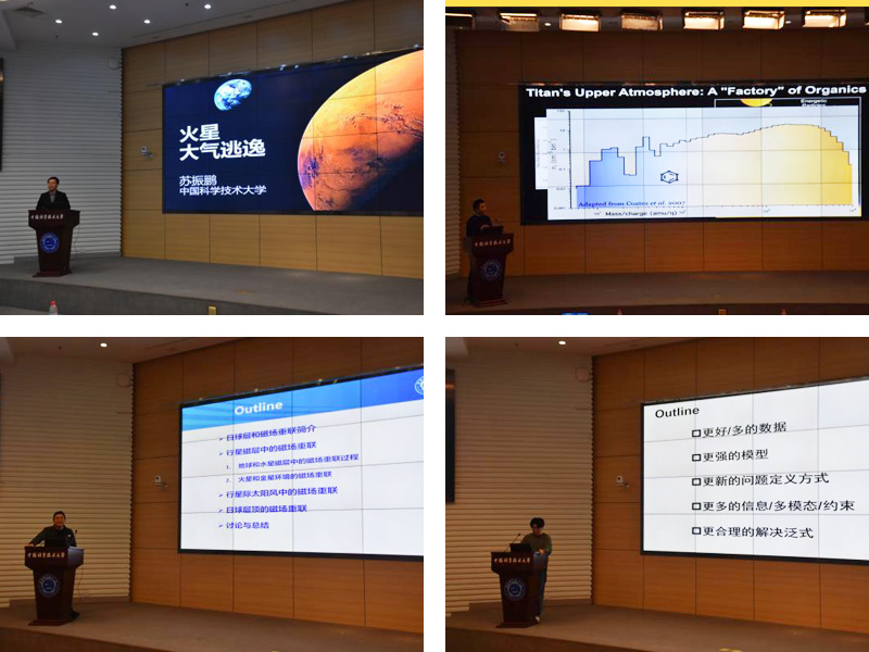 苏振鹏教授、何超教授、王荣生教授、研究生代表绳翰林同学分别从火星大气逃逸、Laboratory Simulations of Chemistry in Planetary Atmospheres、日球层磁场重联研究进展、勘探地球物理大模型的探索等相关领域主题,作了前沿研究专题报告,并与在场研究生同学进行了分享互动和讨论。通过多角度、多学科的讨论,同学们的思路得到了开阔、视野得到了拓展。