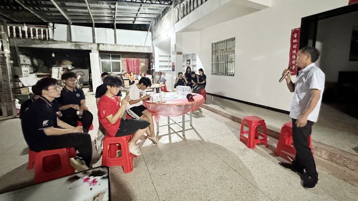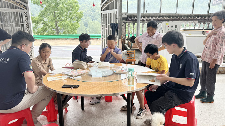 7月10日,同学们邀请村民们接唱歌曲,制作视频,部分同学还为村中孩子辅导暑假作业。当天晚上,大湾村村民汪达海带同学们学唱村歌《情怀大湾》,他还向同学们介绍了村里特色的新年晚会“村晚”。大湾村民淳朴、团结、热情,给同学们留下了深刻的印象。