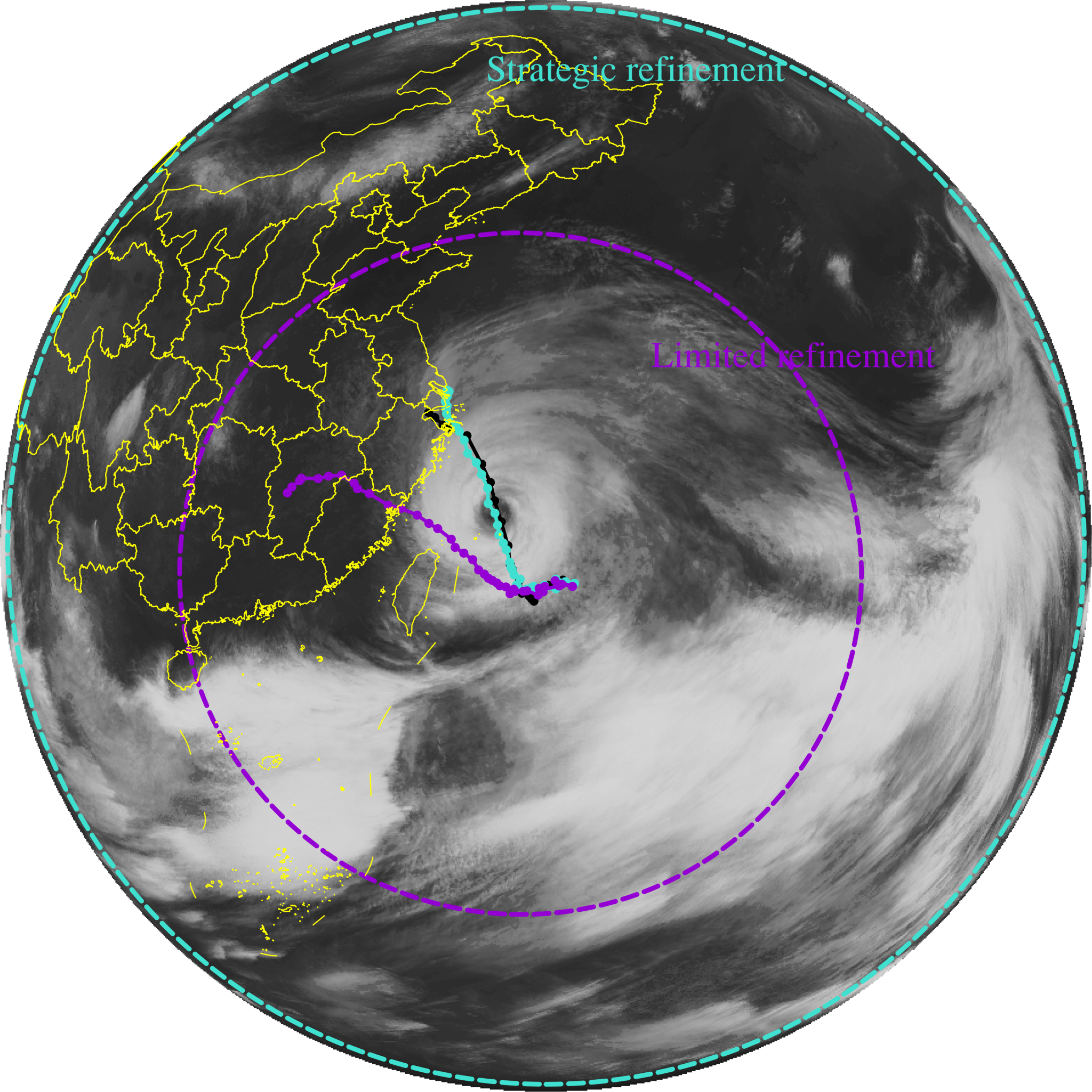 图 2. 加密关键天气系统助力台风轨迹预报的改进
