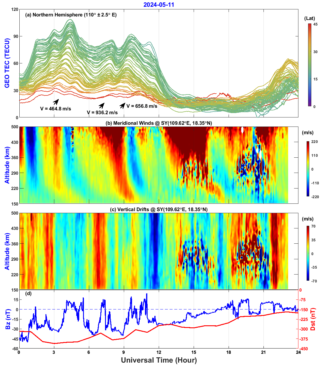 图.2024年5月11日超级磁暴期间中国科大自主建设的北斗同步卫星信标网观测到东经110°不同纬度的TEC变化和“子午工程”三亚非相干散射雷达反演的经向风场(南向为正)和垂直等离子体漂移(向上为正)变化。