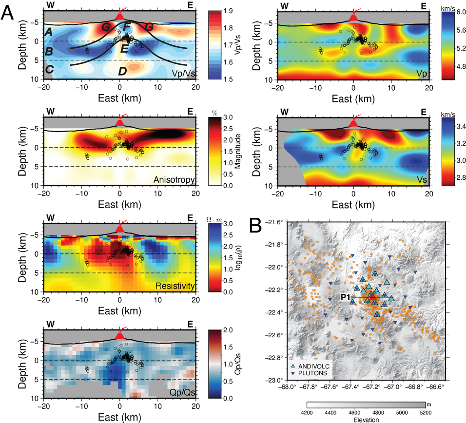 图2(A)沿着东西向垂直剖面P1的Vp、Vs、Vp/Vs、方位各向异性、电阻率和Qp/Qs结构。黑色圆点为重定位之后的地震分布,剖面位置如图B所示。(B)地震(橙色圆点)和台站(三角形)分布,红色三角形为Uturuncu火山口位置。