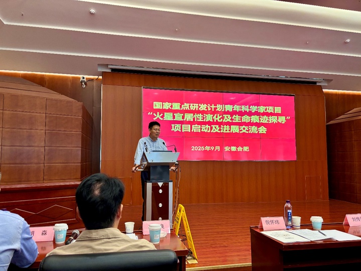 2025年9月20日,由我院地球与行星物理专业潘路教授主持的国家重点研发计划青年科学家项目“火星宜居性演化及生命痕迹探寻”项目启动会在中国科学技术大学顺利召开。会议邀请了中国科学院地质与地球物理研究所的刘传周研究员和胡森研究员、中国地质大学(武汉)的肖龙教授、山东大学的凌宗成教授、成都理工大学的赵宇鴳研究员、香港大学的李一良教授、中国科学院国家空间科学中心的刘洋研究员七位业内知名学者担任咨询专家。中国科学技术大学地球和空间科学学院执行院长倪怀玮教授应邀为会议致辞,项目各分任务负责人及成员30余人参加了会议。