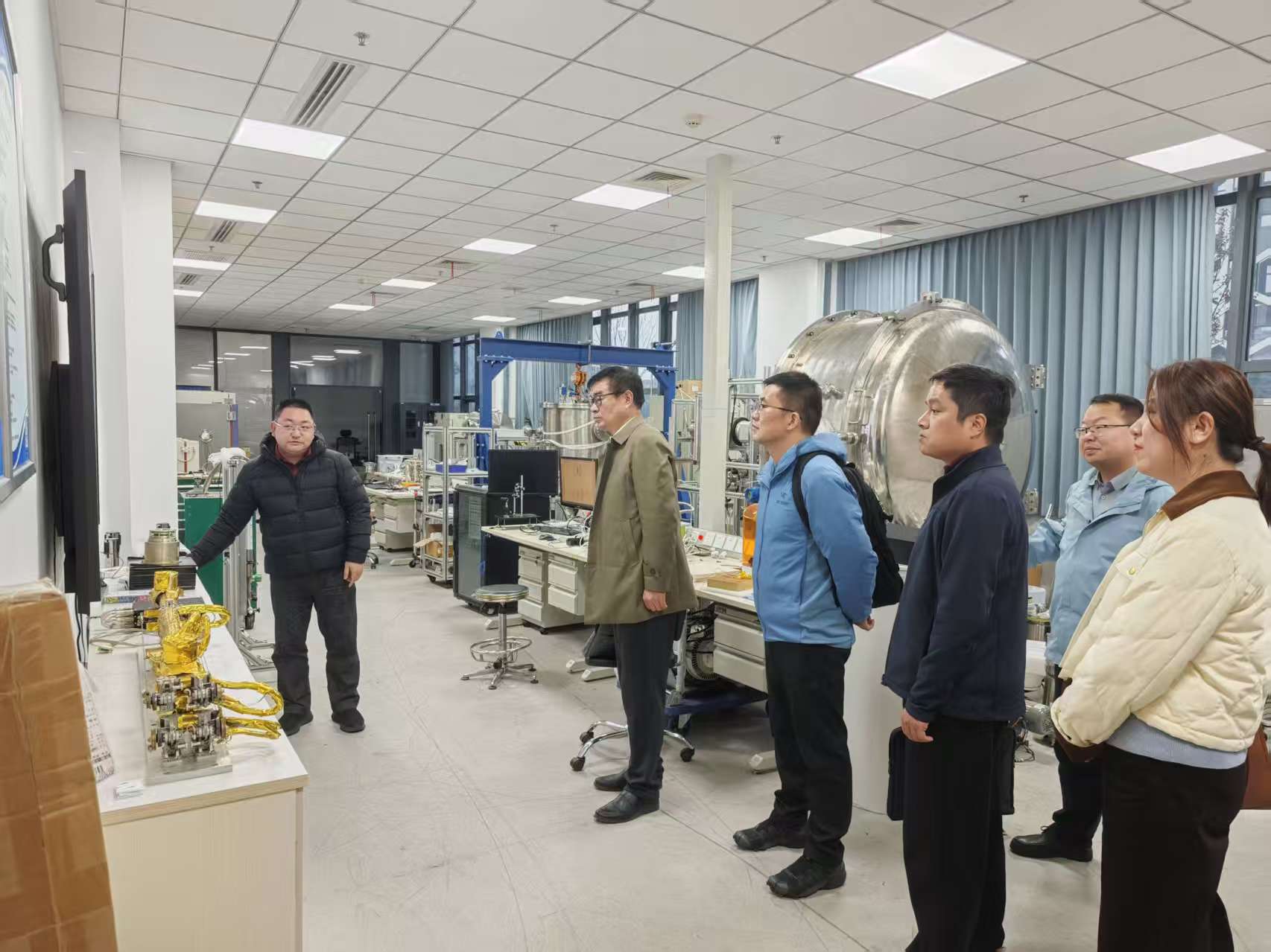 随后,安徽省勘查技术院一行在地空学院支部党员的带领下,先后参观了星载磁强计与等离子体质谱仪研制实验室、量子激光雷达实验室以及空间等离子体实验装置等核心科研平台。参观过程中,科研人员详细介绍了相关仪器设备的技术原理、应用场景及其在空间物理基础研究和深空探测任务中的重要作用。双方围绕精密探测技术、空间环境探测手段及其在地球科学研究、资源勘查实践中的潜在应用展开了热烈研讨和深入交流。