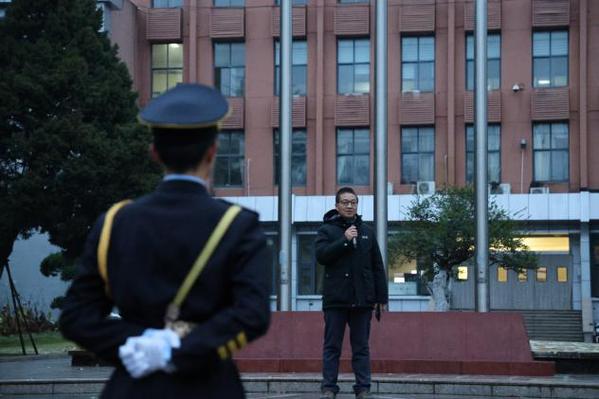 新年将至,万象更新。为激励和引导广大师生校友大力弘扬以爱国主义为核心的伟大民族精神,用奋进之姿开启新年征程,奋力谱写以青春担当共筑中国梦、以团结拼搏创造新辉煌的时代篇章,2026年1月1日早晨7:00,我校2026元旦升旗仪式暨地空学院升旗进支部活动在东区郭沫若广场顺利举行。初雪映衬下,地空学院师生代表与广大校友齐聚一堂,在庄严肃穆的氛围中共同见证国旗升起,迎接新年的到来。