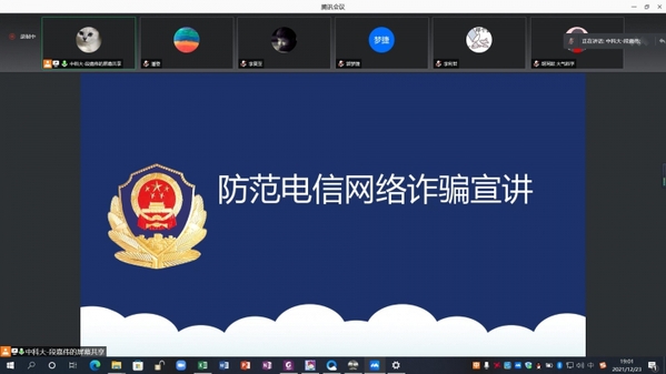 12月23日晚上7点,中国科学技术大学地球和空间科学学院2021级硕博班在线上(腾讯会议)举办了防范电信网络新型诈骗的宣传教育活动。地球和空间科学学院的同学们参与并聆听了由安全委员段嘉伟同学带来的报告。本次宣...