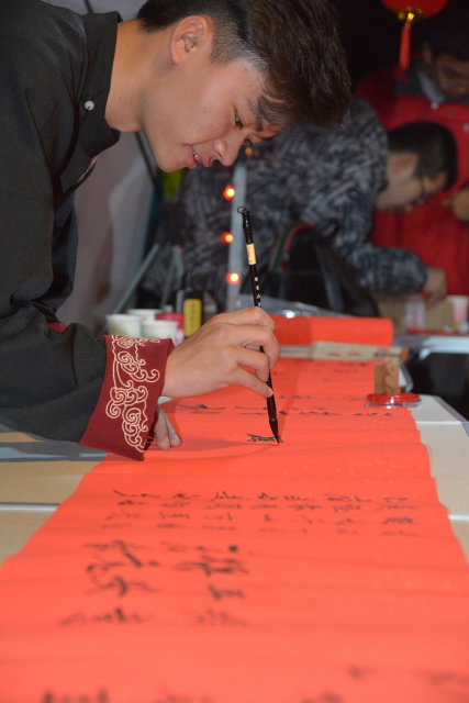首先介绍的是春节展区。作为中国传统第一大节日,春节当然少不了对联了。在展区,工作人员提供了笔墨与春联纸,同学们纷纷卷起袖子手持毛笔,在纸上尽情挥毫,写下自己的美好心愿,也感受着传统书法的魅力。在展区另...