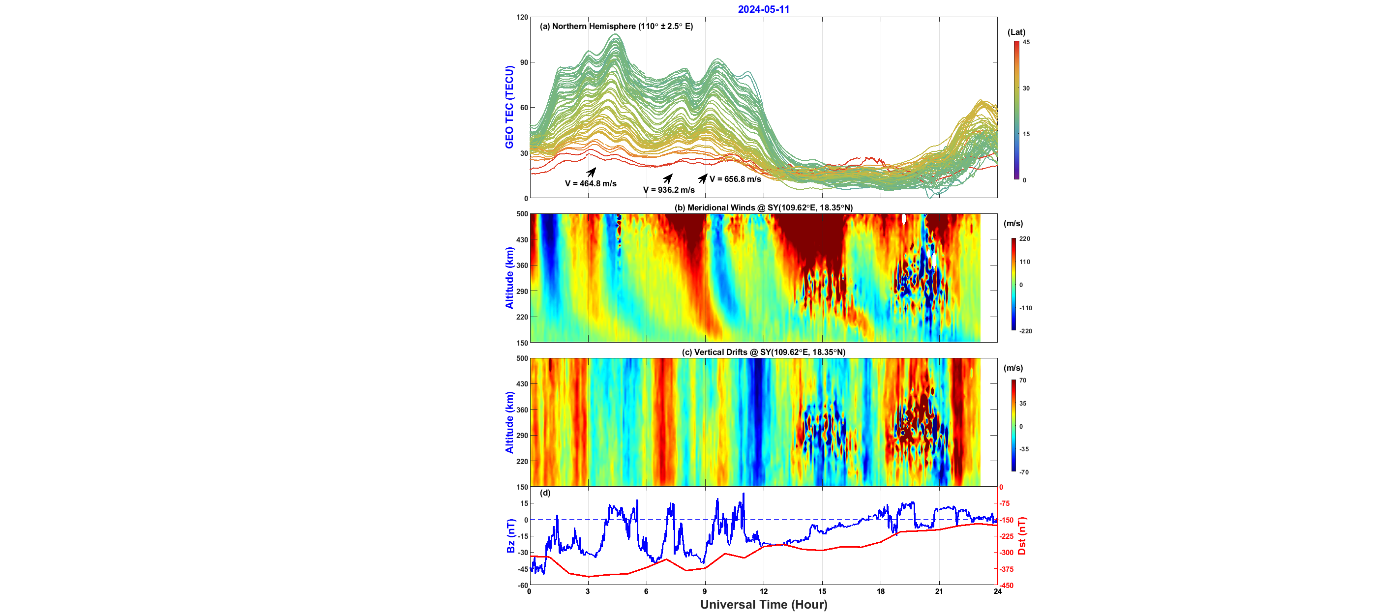 中国科学技术大学雷久侯教授团队联合中国科学院地质与地球物理研究所乐新安研究员和美国麻省理工Haystack观象台张顺荣研究员等国内外合作者,利用中国科学技术大学自主构建的北斗同步卫星信标全国电离层综合观测网,结合“子午工程”三亚非相干散射雷达观测与数值模拟,揭示了“2024年5月超级磁暴”期间我国扇区电离层准周期的异常扰动现象及其物理机制。相关研究成果以“Interplay of Gravity Waves and Disturbance Electric Fie...
